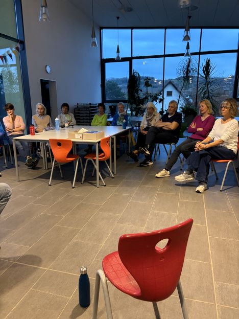 Wir erfuhren von Roland anschaulich den Aufbau des Kniegelenks, das Zusammenspiel von Muskeln, Sehnen und Bändern sowie die Bedeutung der Muskelketten für Stabilität und Beweglichkeit. Außerdem sprach er über typische Abnutzungserscheinungen, häufige Verletzungen im Alltag und beim Sport und wie wir ihnen vorbeugen können.